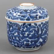 Chinees porseleinen dekselpot met blauw-wit floraal decor, 18e eeuw -randchipje-, hoogte 13 cm