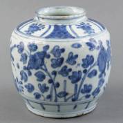 Chinees porseleinen pot met blauw-wit decor van planten en insecten, Wanli -barst in schouder van circa 18 cm-, hoogte 16 cm