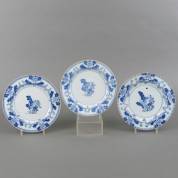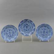 Drie Chinees porseleinen borden met vol blauw-wit bloemdecor in lotusvormige cartouches, gemerkt met bloem, Kangxi -randchips-, Ø 21 cm