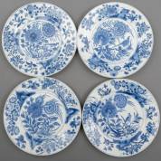 Vier Chinees porseleinen borden met blauw-wit decor: vogels tussen bloemen, gemerkt met wierookvat, Kangxi -randschilfers, twee met haarlijn-, Ø 24,5 cm