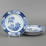 Vijf Chinees porseleinen dubbelborden met blauw-wit decor: treurwilg en bloemen, 18e eeuw -randchipjes, een met bakfout in glazuur-, Ø 26 cm