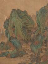 Chinese School: berglandschap met huisjes en figuren, kleur op zijde, niet gesigneerd, mogelijk 16e eeuw, herkomst: Galerie De Ruimte - Oude Aziatische Kunst, Eersel, oktober 1979, daarvoor collectie Ying Cook