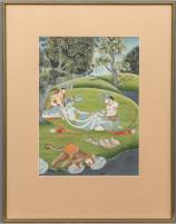 Indiase schildering: 'Lakshman verwijdert een splinter uit de voet van Rama', 20e eeuw, 31 × 22 cm