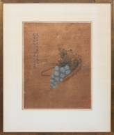 Chinese School: mand met druiventros, aquarel, voorzien van opschrift en zegels -defecten-, 29 × 22,5 cm