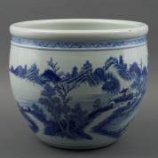 Chinees porseleinen vissenkom met blauw-wit doorlopend rivierlandschapsdecor, modern, 35 × Ø 40,5 cm