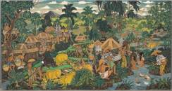 I Ketut Gerembeng (20e eeuw), Balinees dorpsgezicht met figuren en karbouwen, acrylverf op doek, r.o. gesigneerd, tweede helft 20e eeuw -gemaroufleerd-, 85,5 × 160 cm