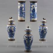 Vijfdelig Chinees porseleinen kaststel met blauw-wit decor op gecraqueleerd fond: figuren in tuin, gemerkt, Nanking, 19e/begin 20e eeuw -deksels alle drie met defecten en verlijmingen-, 19,5 × Ø 8 cm