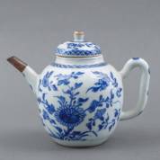 Chinees porseleinen theepotje met blauw-wit bloemdecor, 18e eeuw -tuit defect, binnenrand deksel afgeslepen, glazuurschade aan greep-, hoogte 14 cm