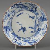 Japans porseleinen dubbelbord met blauw-wit Kakiemon-decor van een tijger bij bamboe, de golvende rand met draken en tempelleeuwen, gemerkt, circa 1700, Ø 24,5 cm