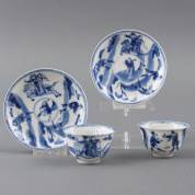 Paar Chinees porseleinen kommetjes en schoteltjes met blauw-wit decor van krijgers, gemerkt, Kangxi -één kommetje met miniem schilfertje-, 4 × Ø 10 cm