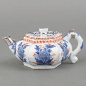 Platte hexagonale Chinees porseleinen Imari theepot met floraal decor, Kangxi, voorzien van zilveren tuit en ketting -schilfers-, 7 × 16 × 10 cm