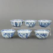 Zes Chinees porseleinen kommetjes met blauw-wit stadsmuurdecor, eerste helft 18e eeuw -twee met haarlijn, schilfertjes-, 4,5 × Ø 9 cm
