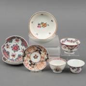 Drie Chinees porseleinen kommetjes, vier schoteltjes en een Japans porseleinen schoteltje, alle met polychrome decors, 18e eeuw -alle met defecten-, 4,5 × Ø 11 cm