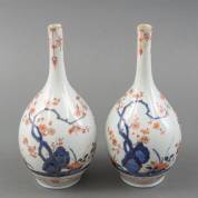 Paar Japans porseleinen Imari verte steelvazen met prunusdecor, 18e eeuw -één met halsrestauratie en grote chip aan onderzijde de ander met kleine randschilfers-, hoogte 24 cm