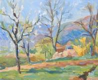 Max Himpe (1920-1975), bloesembomen in heuvelachtig landschap, olieverf op doek op board, 28 × 34 cm