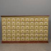 Zachtgroengeschilderde naaldhouten apothekers- of grutterswandkast met 60 laatjes, alle voorzien van witgeëmailleerde plaatjes met namen van kruiden, enkele met nog originele blikken binnenbakken, circa 1900 -gebruikssporen, houten dekplaat van later datum, zonder achterwand-, 123 × 210 × 24 cm