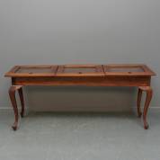Mahonie tafelvitrine met drie beglaasde kleppen, staand op cabriolepoten, modern, 77 × 180 × 49 cm