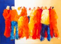 Wil Willemsen (1943), groep figuren in oranje kledij, olieverf op doek, r.o. gesigneerd en gedateerd 2000, 110 × 150 cm