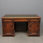 Eiken bureau met groen lederen blad, onder het blad gesneden leeuwenkoppen en deuren waarachter lades, begin 20e eeuw, -gebruikssporen-, 80 × 156 × 82 cm