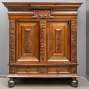 Notengefineerde rankenkast met centraal een bloemguirlande onder de kapregel, en onderin twee lades, staand op bolpoten, 19e eeuw, 216 × 186 × 63 cm
