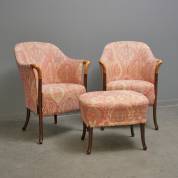 Twee armstoelen met stoffen bekleding in Paisleymotief en pau ferro armleuningen, inclusief bijbehorende ottoman, serie Progetti, uitvoering Giorgetti, Italië, eind 20e eeuw -stoelen wat sleets op de armleuningen-