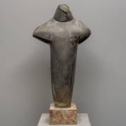 Ben Siebelt (1949), 'Strijder met een lidteken', bronzen sculptuur op natuurstenen sokkel -hoek van sokkel-, 60 × 30 × 14 cm