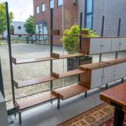 Teakhouten wandsysteem met deels witgelakt front op grijs stalen staanders, uitvoering Simpla Lux, jaren '60, bestaande uit: zes staanders, zes kastjes, en acht planken in diverse maten
