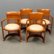 Vier kersenhouten armstoelen met spijlen in de rug en met leder gestoffeerde uitneembare zittingen, model Barrel 606, uitvoering Cassina, ontwerp Frank Lloyd Wright -gebruikssporen-, 80 × 55 × 50 cm