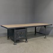Stalen bureau met steigerhouten blad, daaronder een opbergvak met deurtje, 73 × 250 × 100 cm