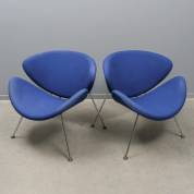 Paar fauteuils met blauwe stoffen bekleding op verchroomd buisframe onderstel, model Orange Slice, ontwerp Pierre Paulin, uitvoering Artifort -gebruikssporen, enkele vlekken in bekleding-, 80 × 83 × 77,5 cm