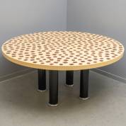 Ronde hoogglansgelakte tafel met ingelegde stukken pau ferro-hout, staand op cilindrische zwarte poten, model Theo, ontwerp Massimo Scolari, uitvoering Giorgetti, Italië -lichte gebruikssporen-, 73 × Ø 160 cm