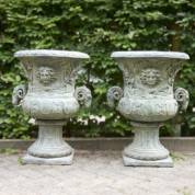 Paar bronzen tuinvazen met ramsmascarons en reliëfdecor: personificatie van de zon geflankeerd door takbundels, 70 × Ø 50 cm