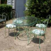 Ovale tuintafel met geslepen glazen blad en groen smeedijzeren onderstel, inclusief vier bijbehorende stoelen -enkele randchips van glazen blad-, 75 × 190 × 70 cm
