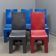Vijf polyetheen (tuin)stoelen in diverse kleuren, model Centraal Museum Stoel, ontwerp Richard Hutten, 1997, herkomst: Centraal Museum Utrecht -gebruikssporen, één blauwe met smeltplek in achterpoot-, 99 × 44 × 59 cm