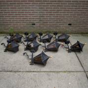 Negen zwartgelakte smeedijzeren lantaarns met goudkleurige knopjes onderop en bovenop, voorzien van bruin glazen ruitjes -enkele ruitjes ontbreken, laklaag wat sleets-, circa 65 × 30 × 35 cm