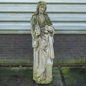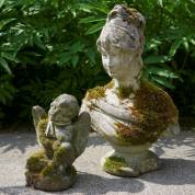 Twee betonnen tuinbeelden: vrouwenbuste, 50 cm, en engeltje, 25 cm -beide met mos-