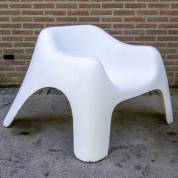Witgelakte glasvezelversterkte kunststof tuinstoel -bij achterpoten komt onderliggende oranje lak tevoorschijn-, 67 × 116 × 87 cm