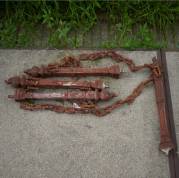 Vier gietijzeren toortsvormige afzetpaaltjes, deels met ketting -verweerd-, hoogte vanaf het grondniveau 73,5 cm