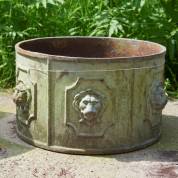 Ronde gietijzeren plantenbak met leeuwenmascarons, 30 × Ø 52 cm