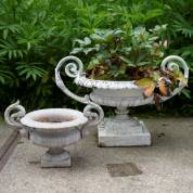 Twee gietijzeren tuinvazen met oren: witgelakt exemplaar, 42 × Ø 47 cm, en lichtgrijsgelakte exemplaar, 27 × Ø 27 cm