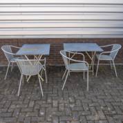 Twee tuintafels op wit ijzeren onderstel, de houten tafelbladen met zink bekleed -één met klein gaatje in zink-, 71 × 90 × 70 cm, en vier grijze metalen stoelen