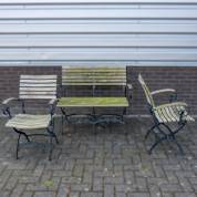 Inklapbare metalen tuinset met houten zitting en rugleuning, bestaande uit bankje en paar stoelen