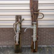Twee gietijzeren waterpompen aan wandplaten -oxidatie, beide defect-, hoogte grootste achterplaat 193 cm