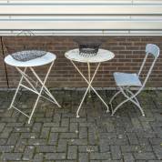 Diverse tuinobjecten: twee ronde witte ijzeren tafeltjes -één met roest op blad-, 71 × Ø 60 cm en 74 × Ø 60 cm, lichtgrijze klapstoel, en twee ijzeren manden