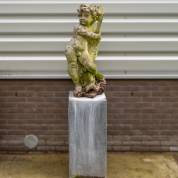 Betonnen tuinbeeld: putto met vis, op met lood beklede sokkel, beeld 90 cm, sokkel 75 × 35 × 35 cm