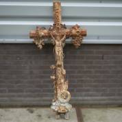 Gietijzeren veldkruis met corpus Christi en bloemen -verweerd-, hoogte vanaf het grondniveau 121 cm