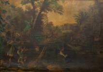 Beschilderde jute wandbespanning met decor van een jachtpartij in 18e-eeuwse stijl, 20e eeuw -defecten-, 231,5 × 317 cm inclusief lijst