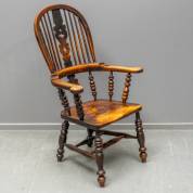 Grote en extra brede iepen Windsorstoel, de rugleuning met gedeeltelijk opengewerkt 'kerstboom'-decor, Engeland, tweede helft 19e eeuw -gebruiksslijtage-, 112 × 69 × 49 cm