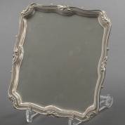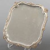 Vierkant 1e gehalte zilveren cabaret, de rand gedecoreerd met bladmotieven, staand op vier krulpootjes, meester: Rutgerus Memelingh, 's-Gravenhage, 1783, gewicht 429 gram, circa 2,5 × 21 × 21 cm