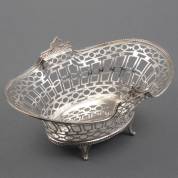 1e gehalte zilveren mandje op vier pootjes met ajourgezaagde geometrische motieven, afgezet met parelrand, Engels en Duits gemerkt, Sheffield, 1911, gewicht 209 gram, 10 × 20,5 × 13 cm